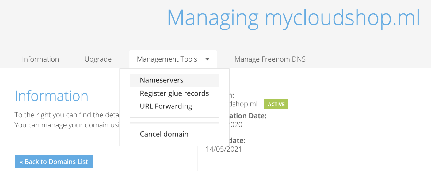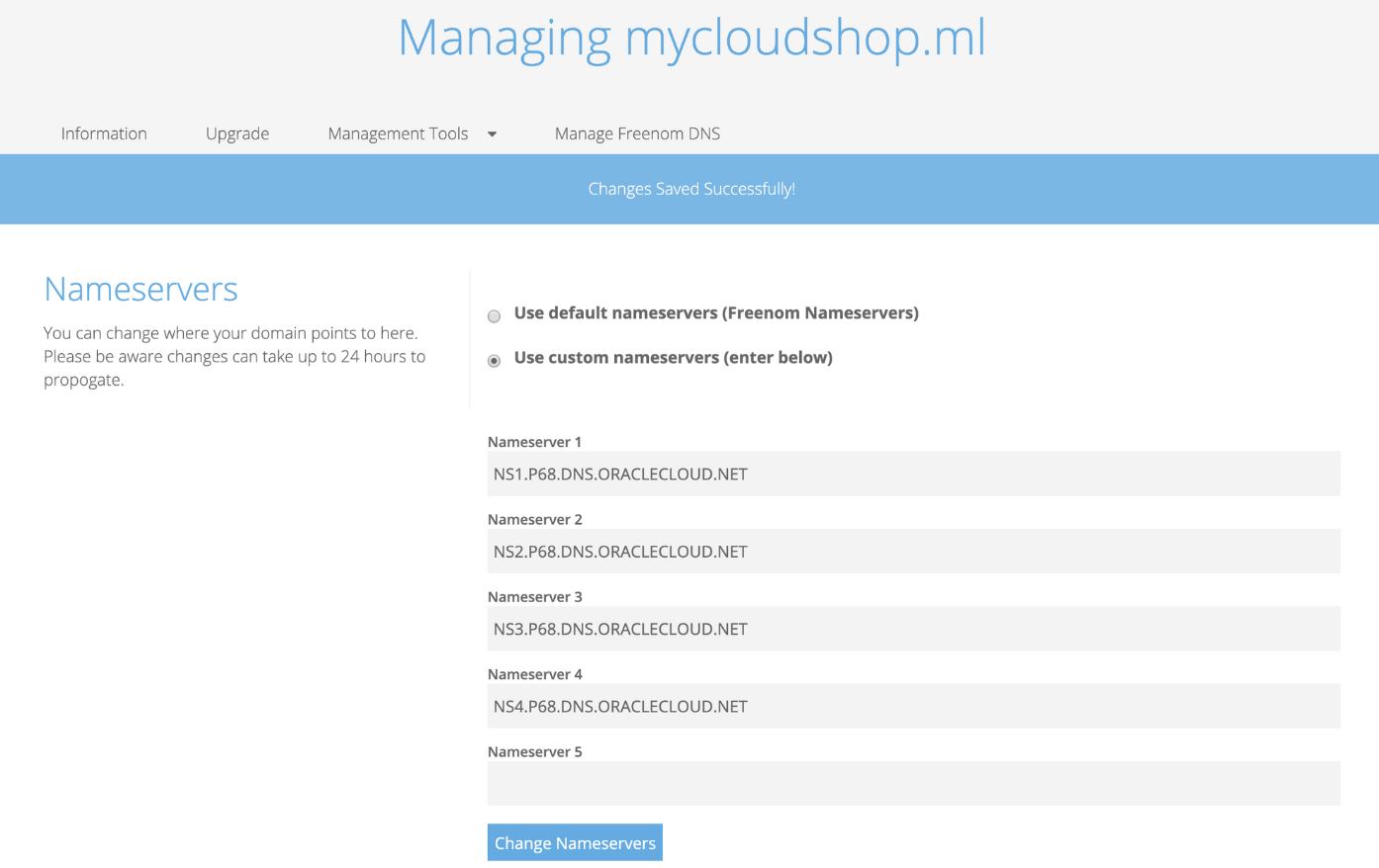 생성되고 나면 해당 Zone의 Nameservers가 나오게 되는데 이 서버 주소를 freenom.com에서 변경해야 한다.