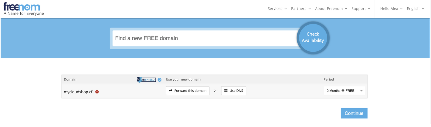 사용하고자 하는 도메인을 검색하면 아래와 같이 사용할 수 있는 도메인 결과를 보여주고 무료로 구매 할 수 있다.