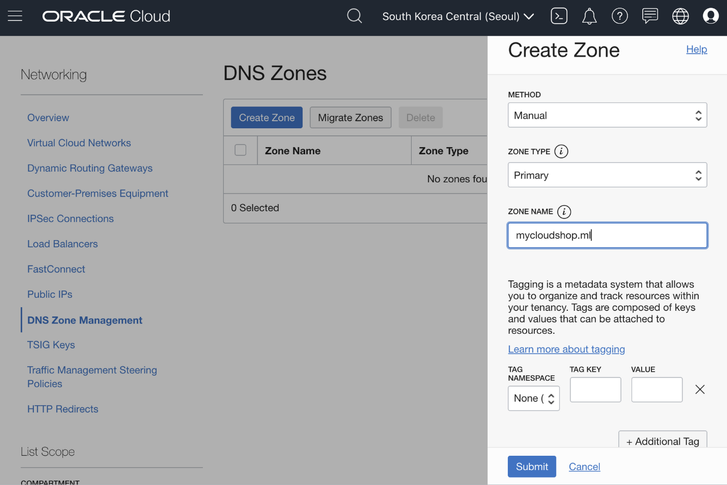 Name Server는 Oracle Cloud의 DNS Name Server로 변경한다. 그러기 위해서는 오라클 클라우드의 DNS Zone을 생성한다. Zone 이름은 위에서 구매한 도메인 이름을 사용한다.