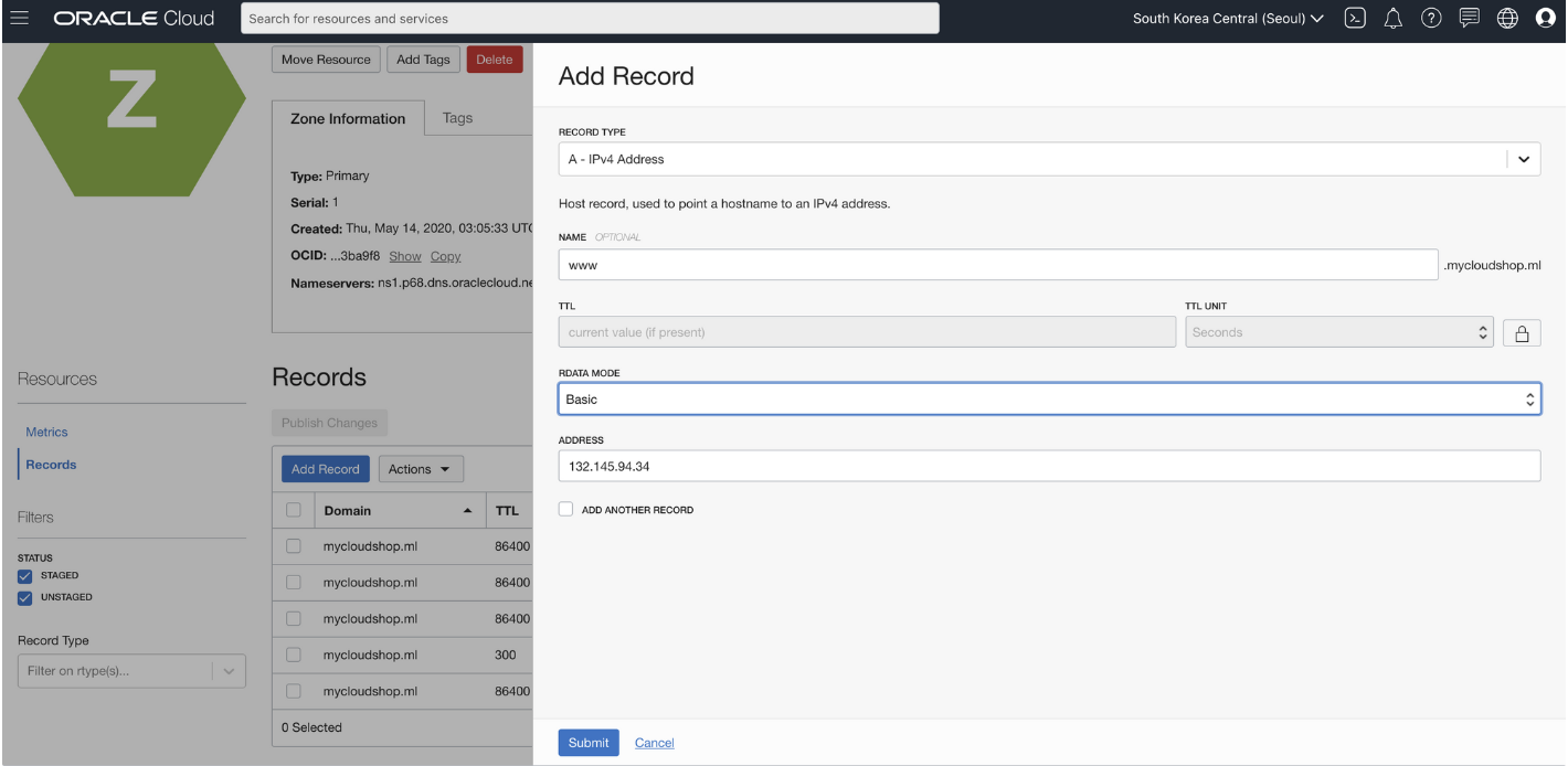 이제 오라클 클라우드 해당 도메인을 관리할 수 있고, 테스트로 기존에 생성된 VM에 할당된 IP를 A Record로 등록해주고 해당 서버에 접속을 할 수 있다.