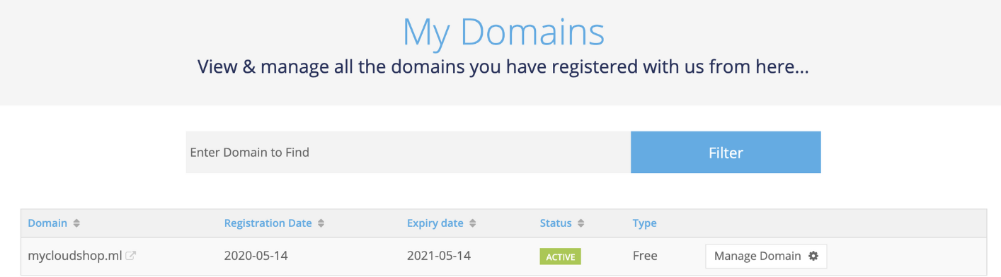 성공적으로 등록되고 나면 My Domains 영역에서 구매한 도메인을 볼 수 있다.