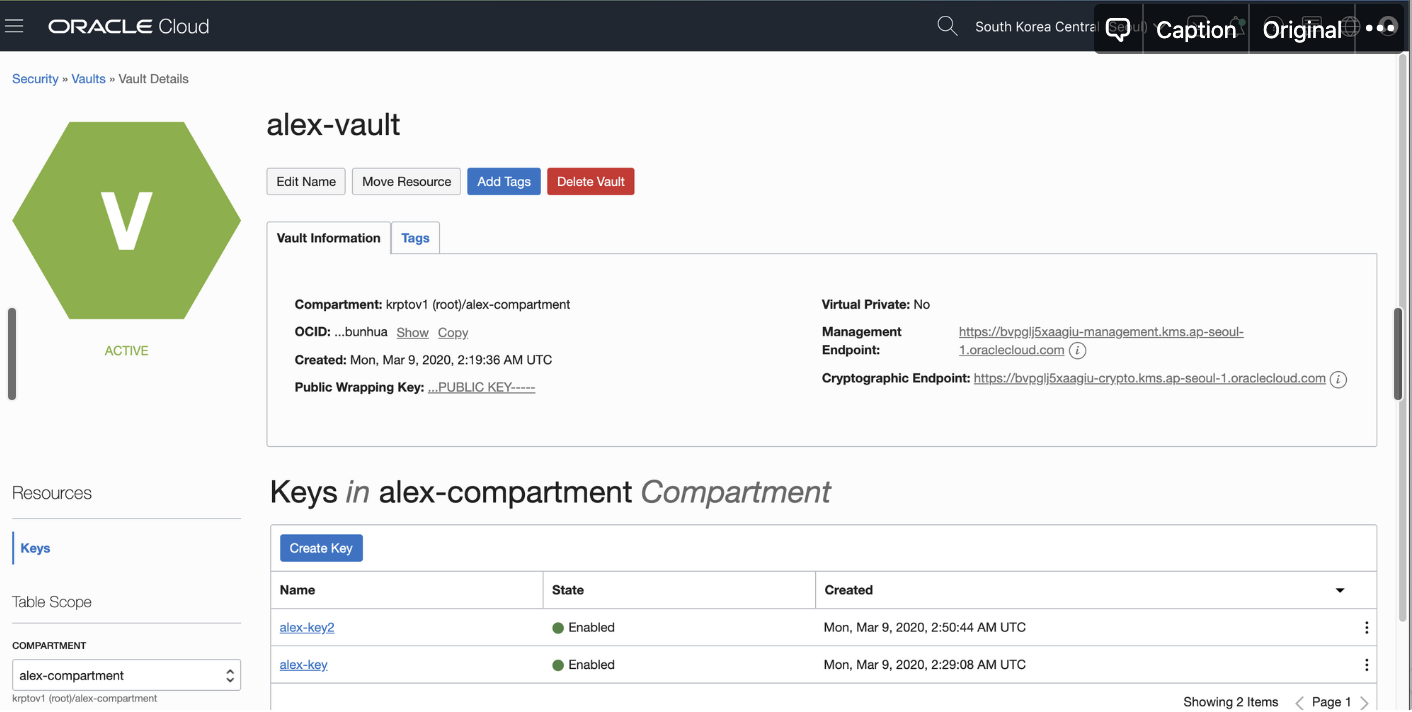오라클 클라우드에서는 Key Management System(KMS)를 통해 오라클에서 제공하는 키 이외에도 사용자가 직접 키를 생성해서 사용하거나 현재 사용하고 있는 키를 Import해서 사용할 수 있다.