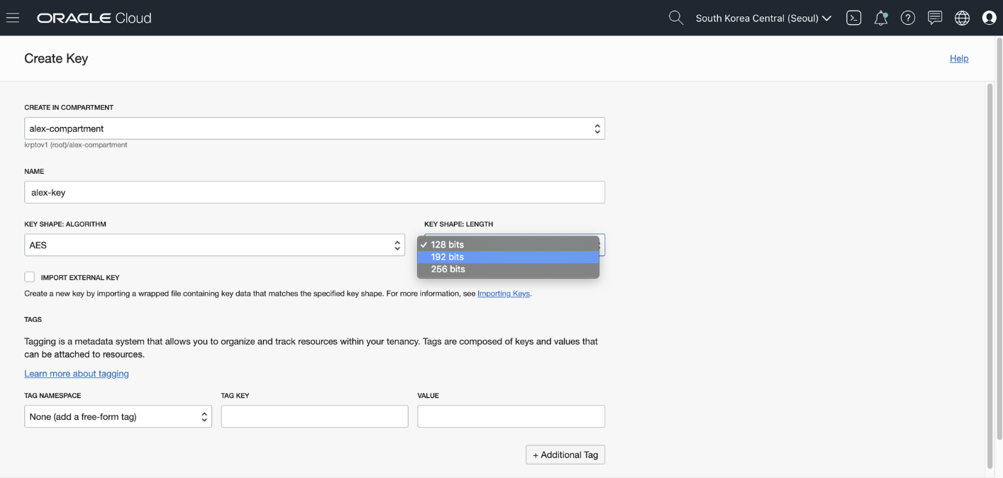 Key생성은 Create Key를 통해 생성되며 간단하게 암호화 알고리즘만 선택하면 된다. 그리고 필요시 IMPORT EXTERNAL KEY를 통해 외부에서 생성한 키를 Import할 수 있다.