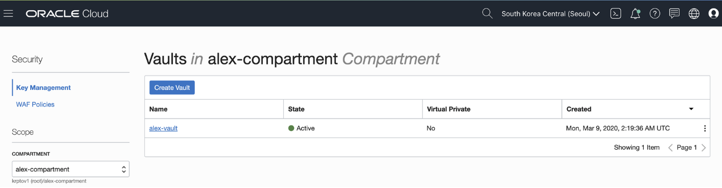 Security → Key Management 로 진입해서 Vault를 생성한다.