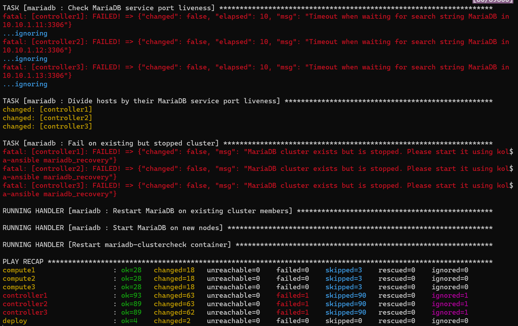 kolla-ansible을 통해 OpenStack을 배포할 때 아래와 같이 MariaDB 문제가 발생을 할 경우 mariadb_recovery 명령어를 수행해도 문제가 생기는 경우가 있다.