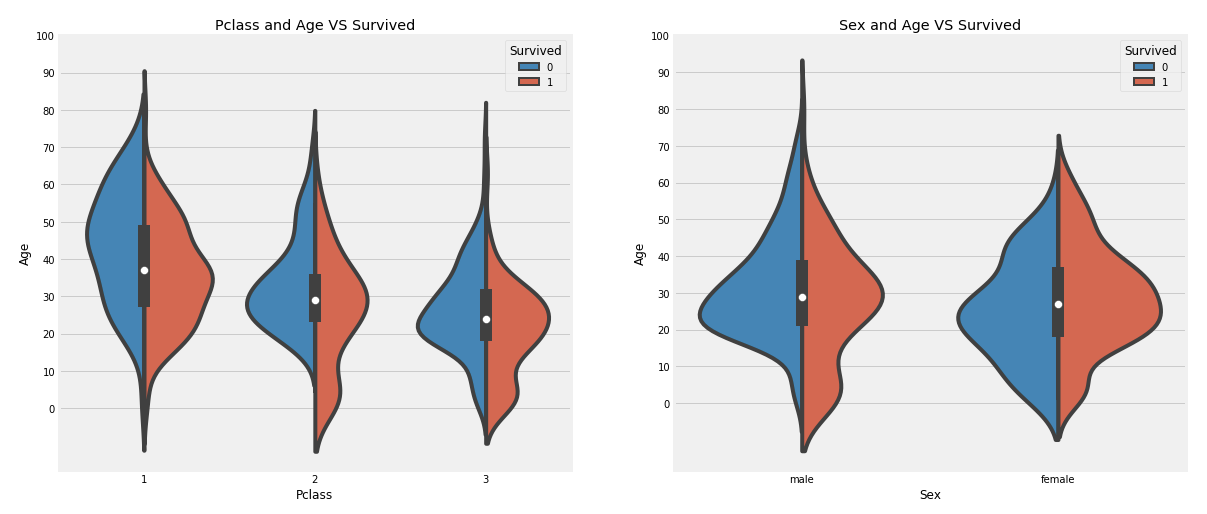 바이올린 플롯으로 객실과 나이에 대한 생존자 비율, 성별과 나이에 대한 생존자 비율을 살펴본다.