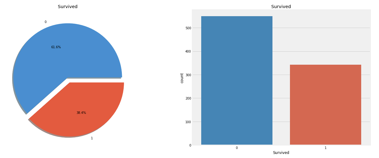 Survived 가 1이 생존자를 표시함. 대략 38.4%가 생존했으며 300명 이상이 생존하고, 600명 가까이 사망한 것을 알 수 있다.