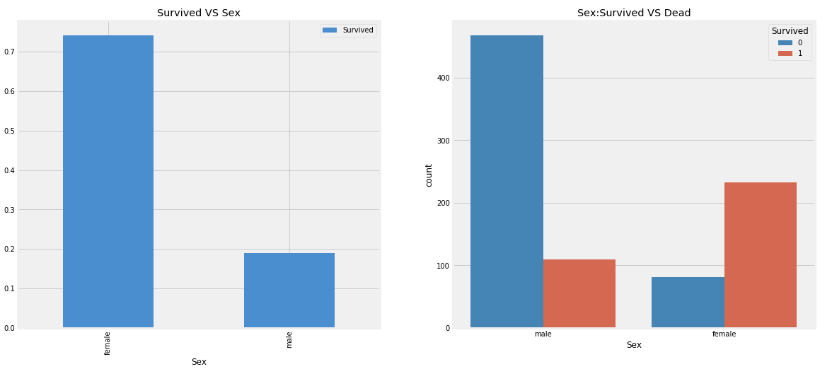성별로 생존자의 비율을 확인해보고, 성별별로 생존자와 사망자 숫자를 확인한다.