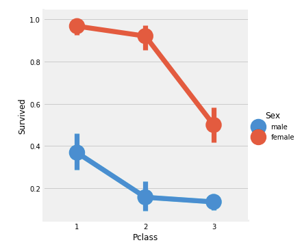 Factorplot을 통해 객실등급과 생존자의 관계를 성별로 나누어 한번에 살펴본다.