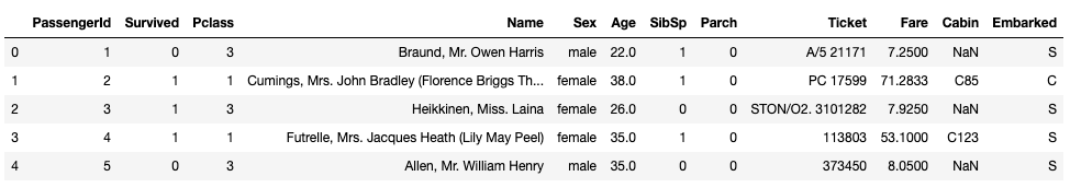 데이터는 생존(Survived), 객실등급(Pclass), 이름, 성별, 나이, 형제와배우자(SibSp), 자식과부모(Parch), 티켓, 요금, Cabin, 탑승한곳(Embarked)로 구성되어 있다.