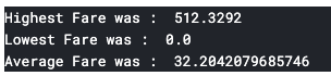승선비용(Fare)에 대한 데이터를 분석을 해 본다. 제일 비싼 티켓과 제일 싼 티켓, 평균 티켓 비용을 확인한다.