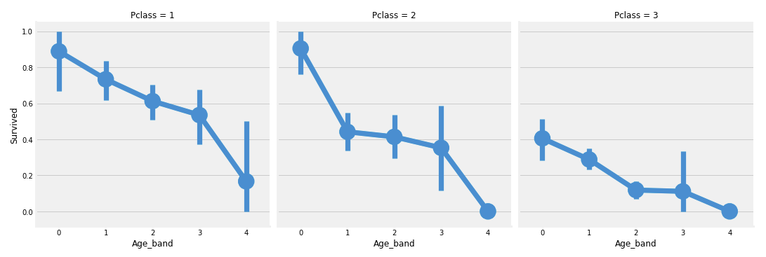 Factor차트로 객실별로 생존율과 나이 구간에 대해 확인한다.