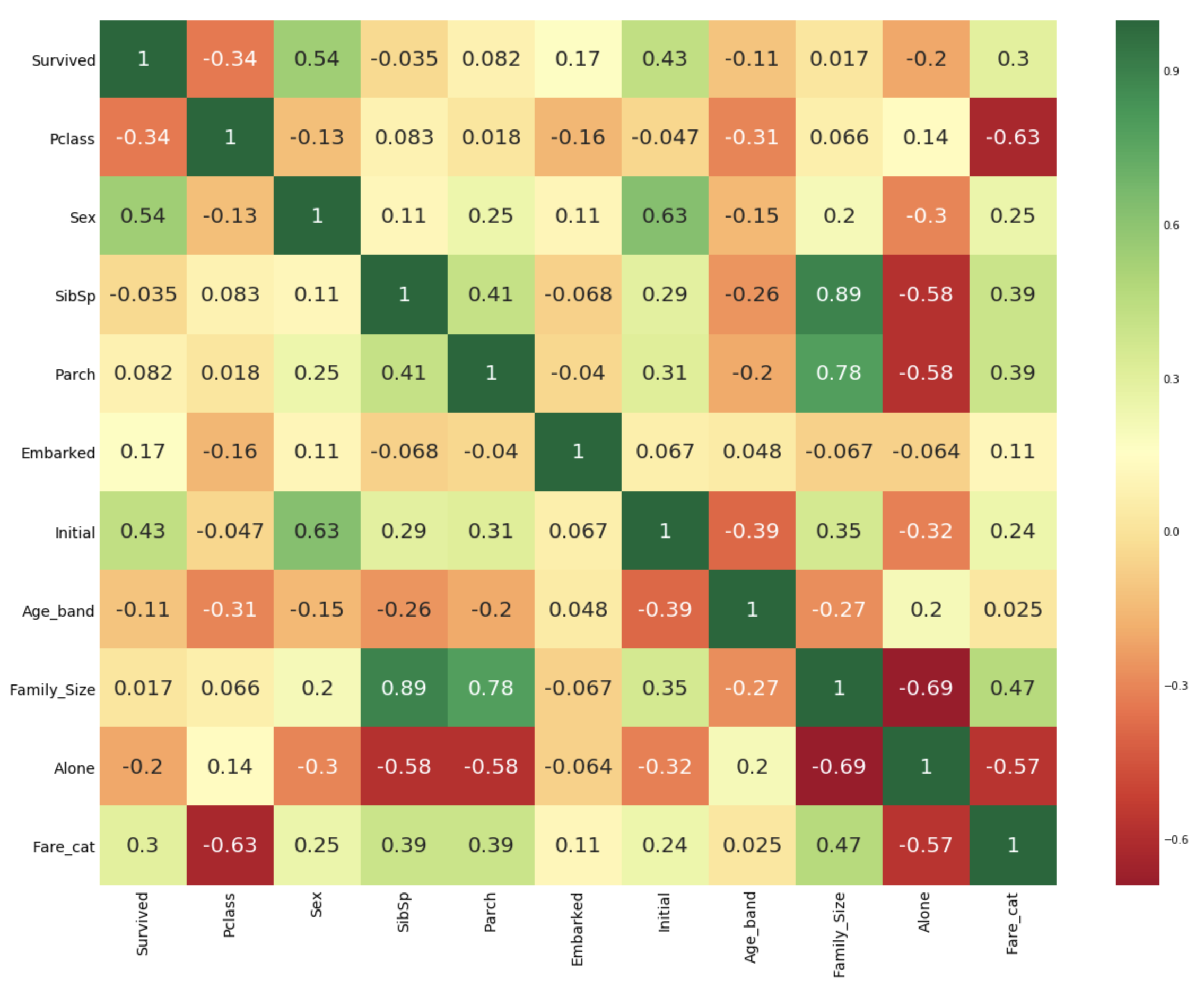 그래서 heatmap으로 상관관계를 살펴보면 positive 는 SibSp와 Family_Size, Parch와 Family_Size, Negative는 Alone과 Family_Size 로 알 수 있다