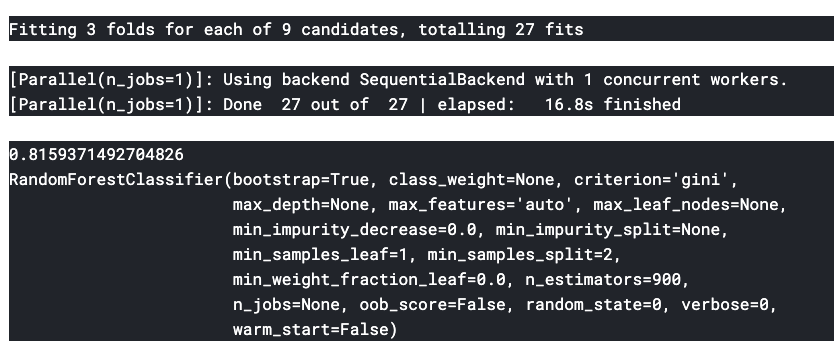 n_estimators값을 100에서 1000까지 100단위로 넣어서 확인한다. n_estimators가 900일 때 최적의 값을 찾는 것을 알 수 있다.