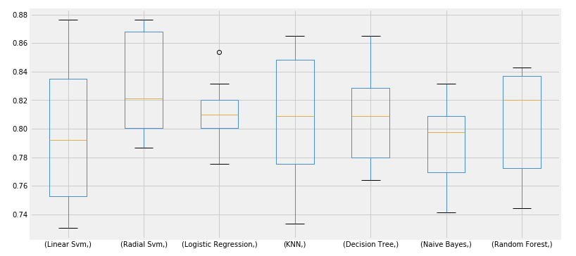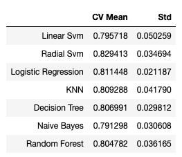 위에서 여러가지 모델을 가지고 prediction을 한 것을 다 모아서 평균값과 표준편차를 구해본다. 표준편차가 제일 적은 것은 Logisitic Regression이고 제일 큰것은 Linear Svm인것을 알 수 있다.