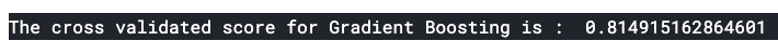 print('The cross validated score for Gradient Boosting is : ',result.mean())