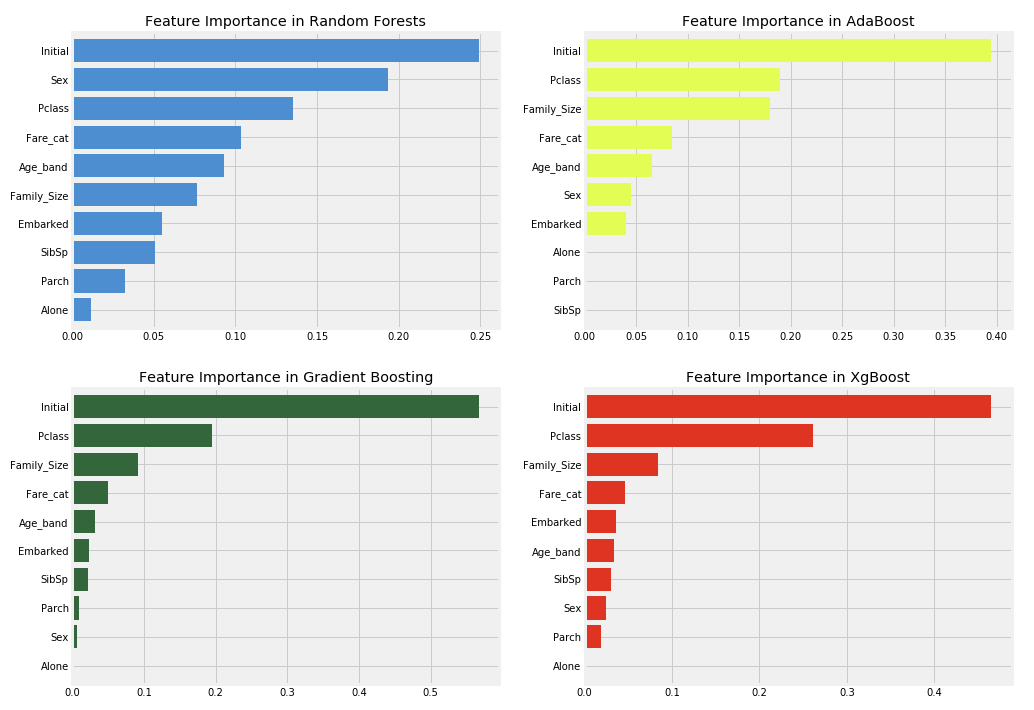 Random Forest, AdaBoost, Gradient Boosting, XgBoost를 통해 Feature의 중요도를 판별한다. 각 알고리즘 별로 중요도는 조금씩 틀리게 나오는 것을 확인 할 수 있고, Initial의 값들이 가장 중요한 것으로 보인다. 그런데 특이한 점은 여자일 경우 생존율이 높다라고 계속 확인을 했지만 실제로 알고리즘에서는 Sex의 중요도는 낮은 것을 알 수 있다.
