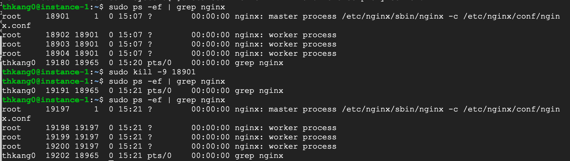 현재 떠 있는 상황에서 nginx를 kill하고 난 뒤 systemd가 restart를 시키는지 확인해본다.
