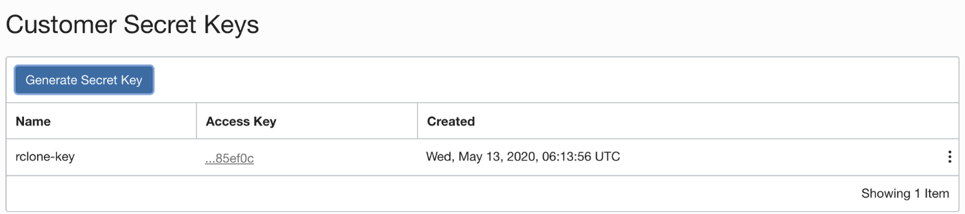 rclone에서 S3를 지원하기 때문에 Oracle Cloud에서 S3형태로 Access할 수 있는 access_key와 secret)key를 생성한다.