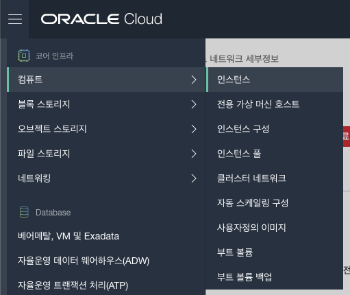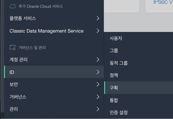 왼쪽 상단의 햄버거 버튼(메뉴버튼)을 누르면 아래와 같이 ID 밑에 구획(Compartment)으로 가서 새로운 구획(Compartment)를 루트 아래 생성을 한다. 참고로 구획(Compartment)는 리소스를 포함하고 관리할 수 있는 가상의 영역이라고 생각하면 된다. 이 구획(Compartment) 아래에 각종 리소스들, 네트워크, VM, 스토리지, IP등등을 가질 수 있다.