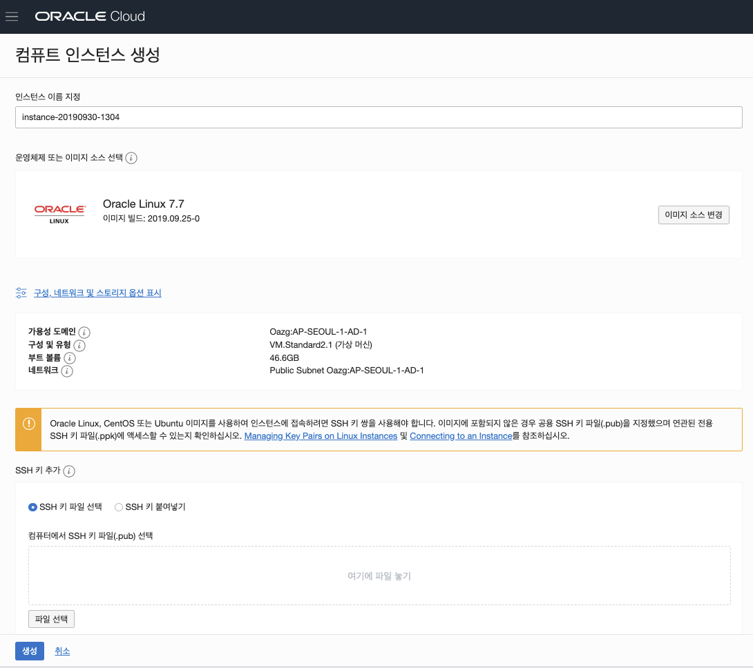 인스턴스를 생성하기 위해서는 인스턴스 이름과 운영체제(이미지), VM에 접속하기 위한 SSH 키가 필요하다. Mac이나 리눅스 유저는 ssh-keygen을 통해서 생성된 ~/.ssh/id_rsa.pub 파일을 아래 SSH 키 항목에 올려두거나 해당 내용을 카피한 뒤 생성을 하면 되고, 윈도우 유저의 경우에는 Putty를 통해서 생성을 하면 된다. https://docs.cloud.oracle.com/iaas/Content/Compute/Tasks/managingkeypairs.htm#three