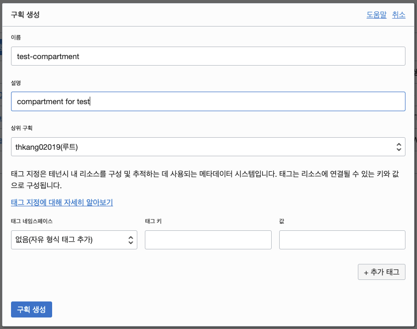 구획 생성을 누르면 아래와 같은 폼이 나타나며 입력해야 하는 값은 이름과 설명 밖에 없다. 나중에 VM이나 네트워크를 생성할 때 해당 구획에 생성할 것이다.